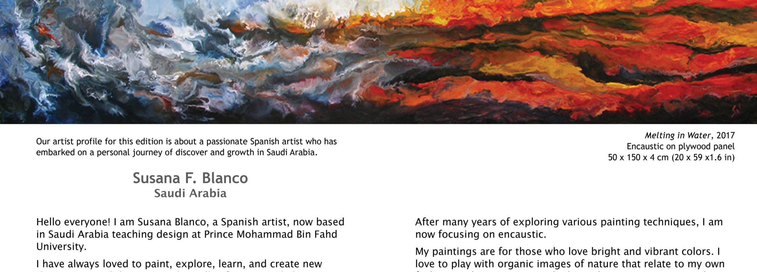Susana F. Blanco, PhD, is an accomplished artist and Assistant Professor whose vibrant encaustic paintings capture the essence of nature and culture. With a doctorate in Fine Arts from UCM, Madrid, Spain. She teaches at the Royal University for Women in Bahrain, inspiring students through art and design.